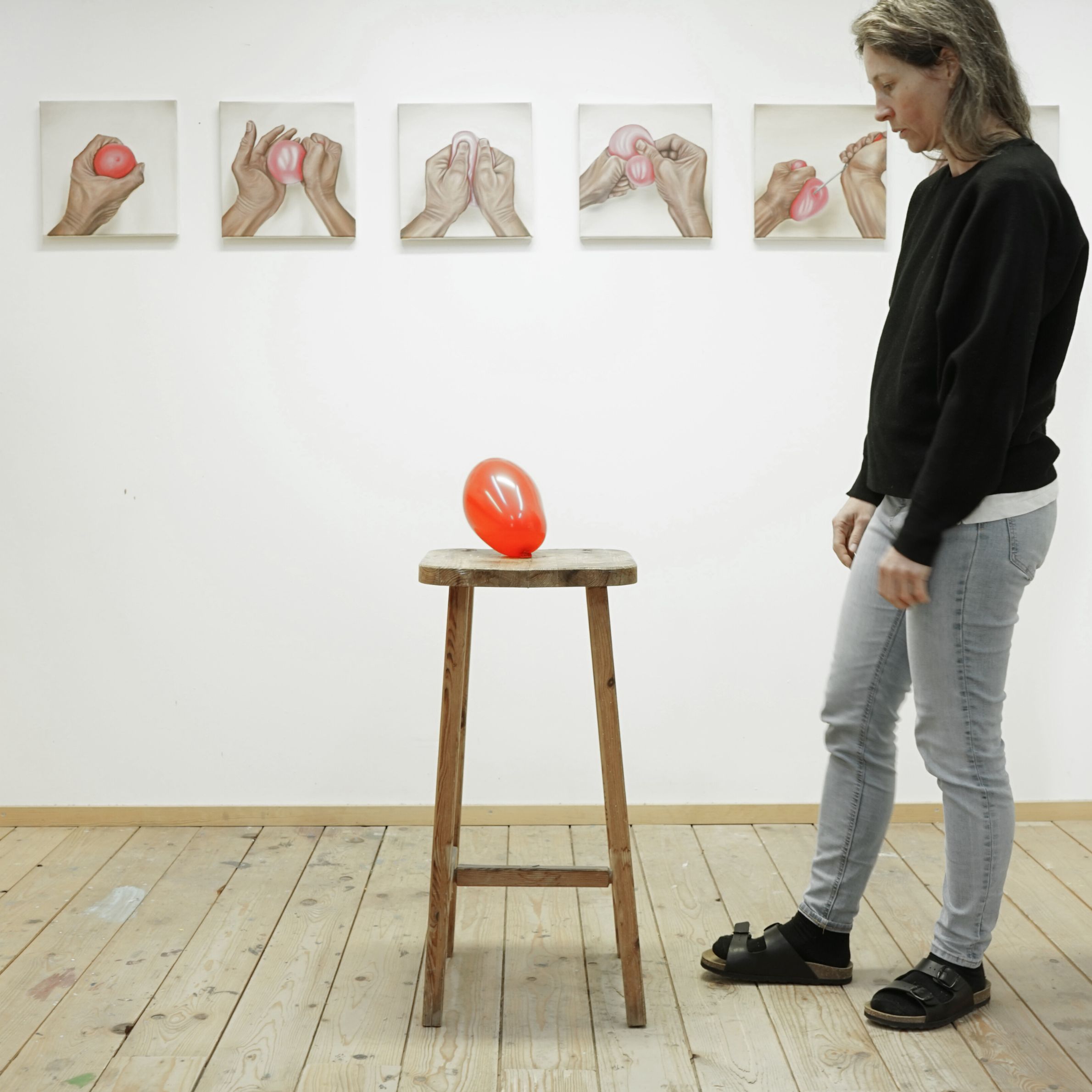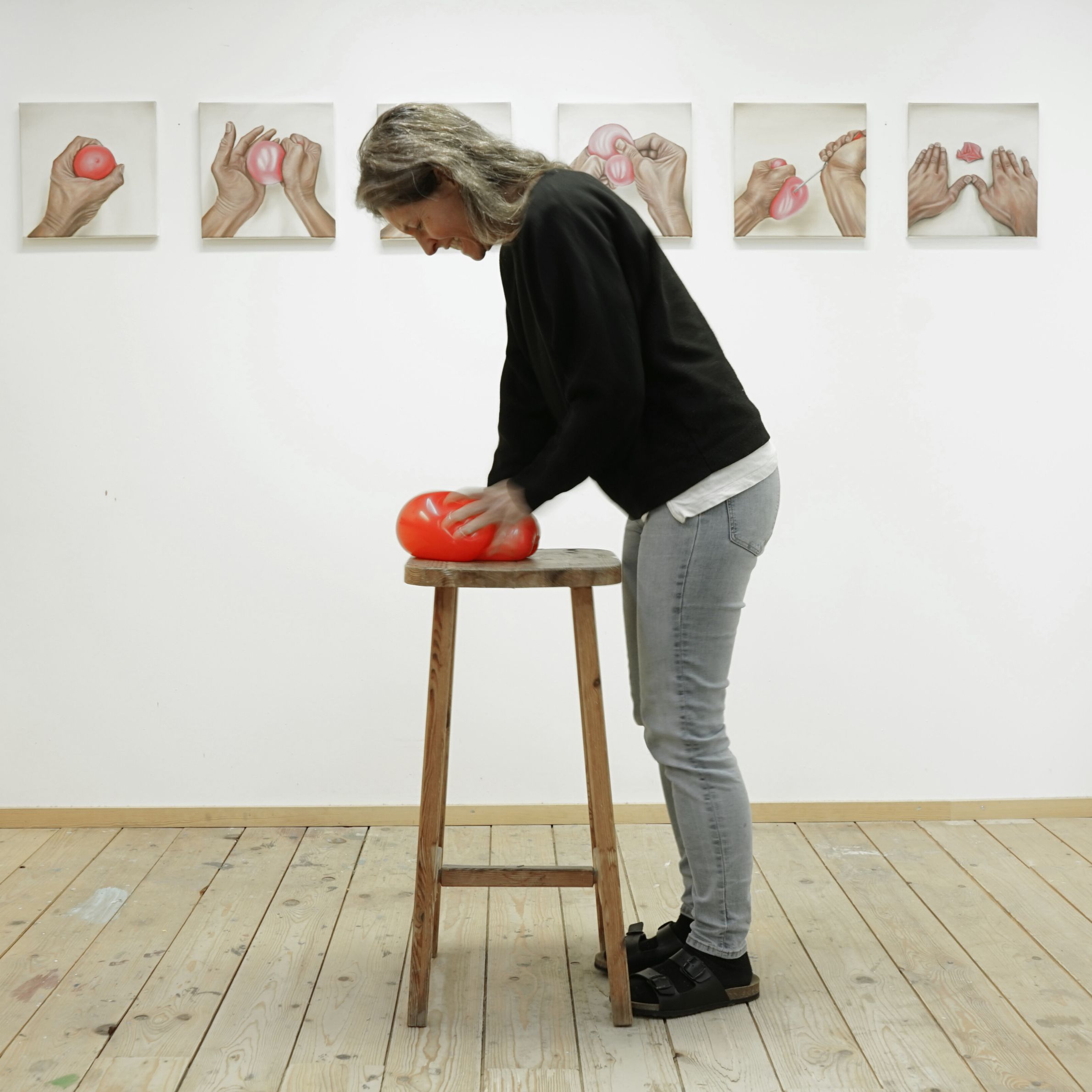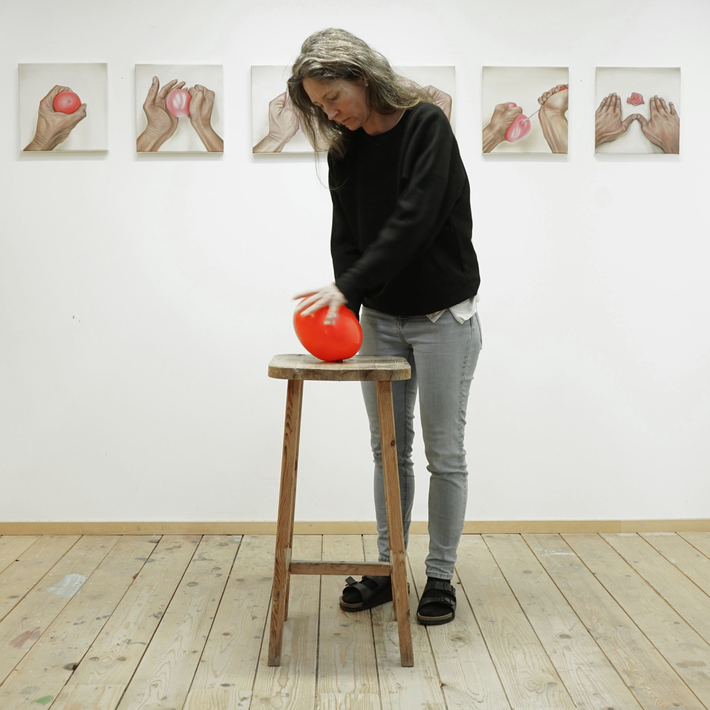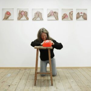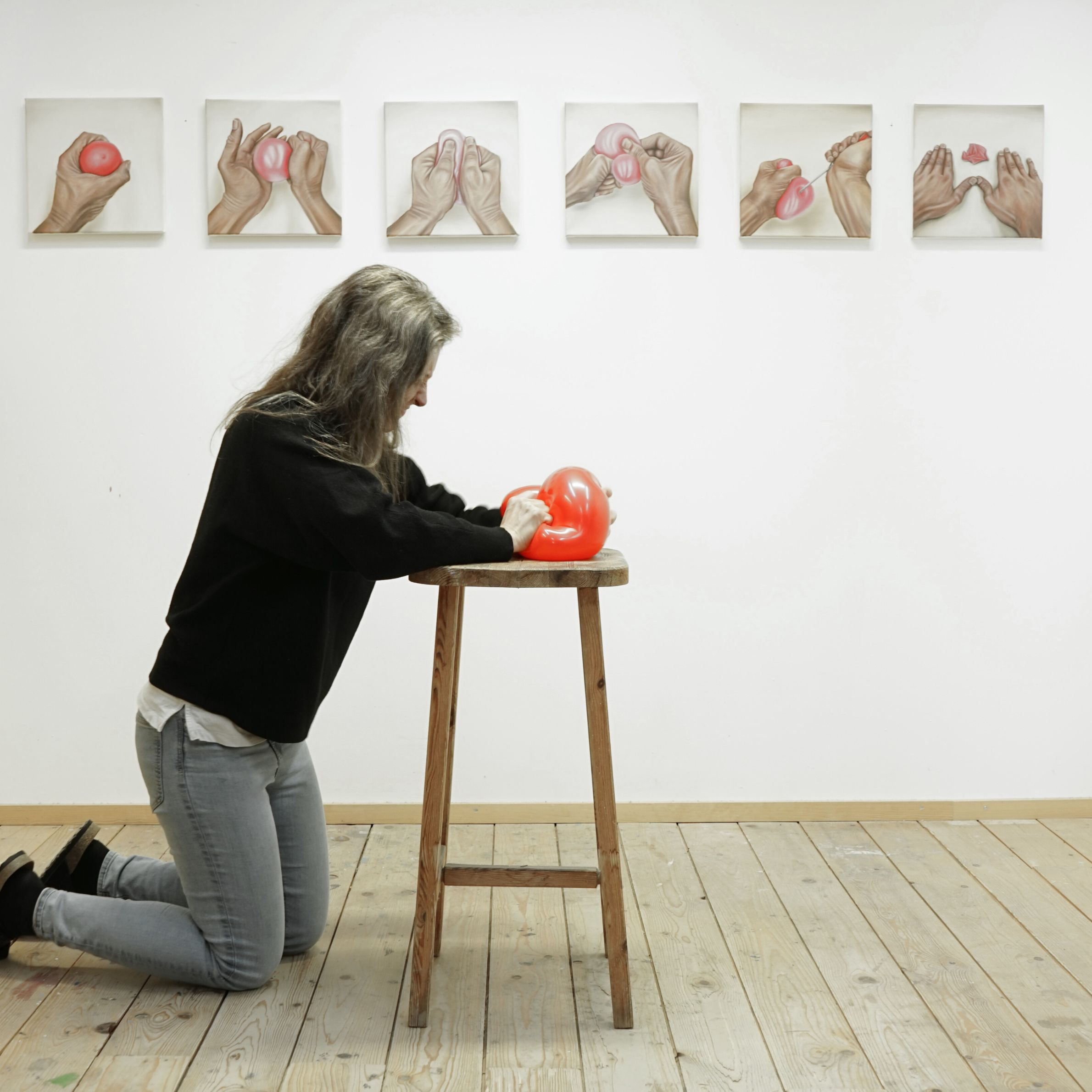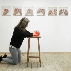 Das rote Band, steht symbolisch für die Zusammenhänge von Beziehungen im Spannungsfeld unterschiedlicher Kräfte. Diese Bünde und Vernetzungen lassen ein Innen, ein Außen und Dazwischen erleben. Der Betrachter kann sich sprichwörtlich durch die Vernetzung hindurch bewegen und erlebt dabei die vielschichtigen Beziehungen zu den einzelnen Ankerpunkten. Ebenfalls zu dieser Arbeitsreihe gehören die so genannten „Seilinstallationen“. Diese, meist großflächig, aus einem dicken roten Seil gespannten Netzwerke nehmen Räume, Plätze oder Landschaften ein und erzeugen eigenständige Gebilde, die durch die Vernetzung einzelner Ankerpunkte entstehen. Figurative Darstellungen, der vorwiegend in Öl auf Leinwand gemalten Bilder veranschaulichen Momentaufnahmen von Beziehungszuständen. Abstrakte Bildfolgen nehmen dem Thema die Schwere und bieten Spielraum für Interpretationen.